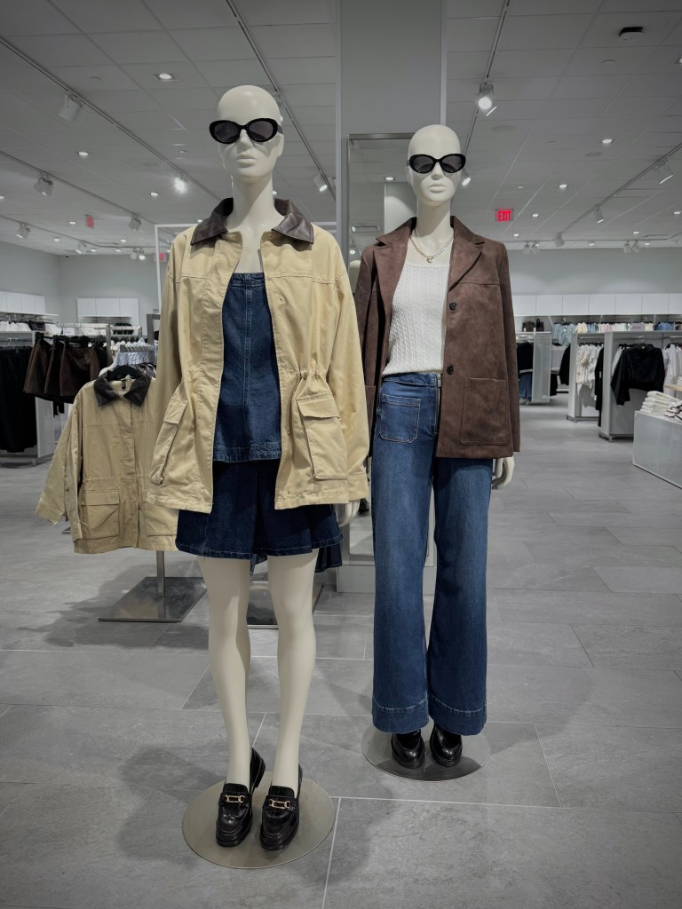 Fashion retailer H&M displays popular jackets, denim-wear, sweaters and shoes on two mannequins. Quiet luxury is a trending aesthetic that’s based off of logo-less, tailored and modest clothing style; typically attempting to resemble luxury brands.