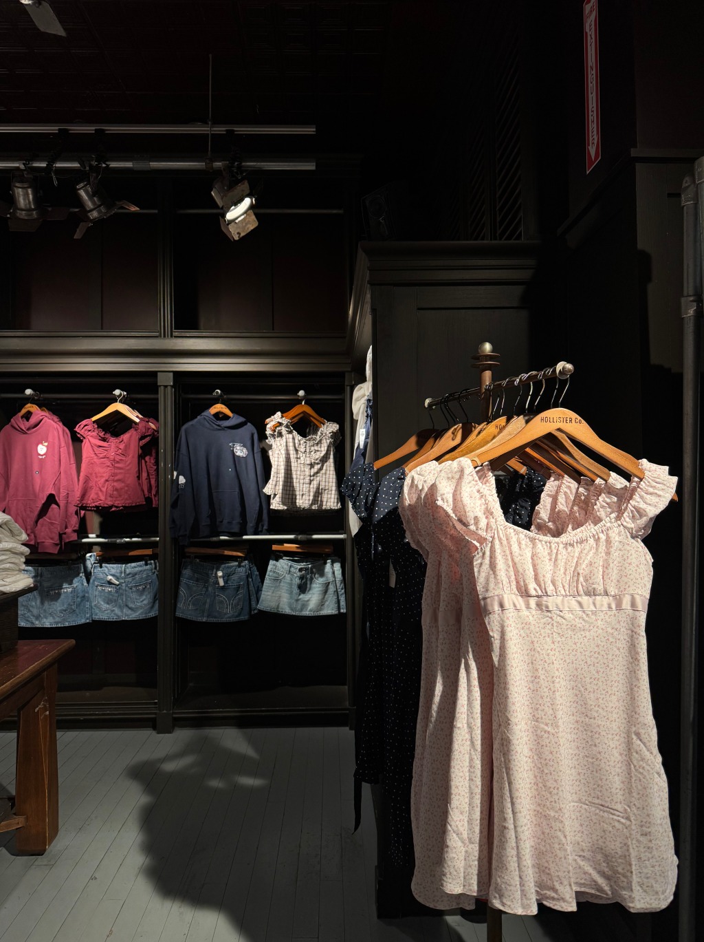 Retail store Hollister showcasing trending dresses and blouses that have floral and plaid patterns on light, softer colors in their store. Popular styles such as “trad-wife” or “cottagecore” romanticize domestic, traditional lifestyles through pastel colors and modest, vintage designs.