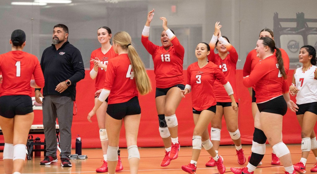The Waubonsee women’s volleyball team celebrates after securing a match win during the Region 4 Crossover Tournament. The Chiefs finished the weekend undefeated, topping four opponents over two days.