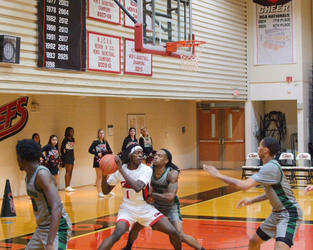 Freshman forward Freddy Hassan navigates through the paint during the Chiefs’ 106–79 win over Kishwaukee College. Hassan finished the game with a team high 18 points and 10 rebounds.